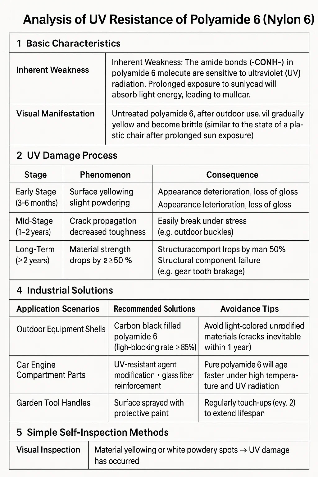 Inherens gyengeség: A poliamid 6 molekulában lévő amidkötések (-CONH-) érzékenyek az ultraibolya (UV) sugárzásra. A hosszan tartó napfénynek való kitettség elnyeli a fényenergiát, ami a molekulalánc megszakadásához vezet.