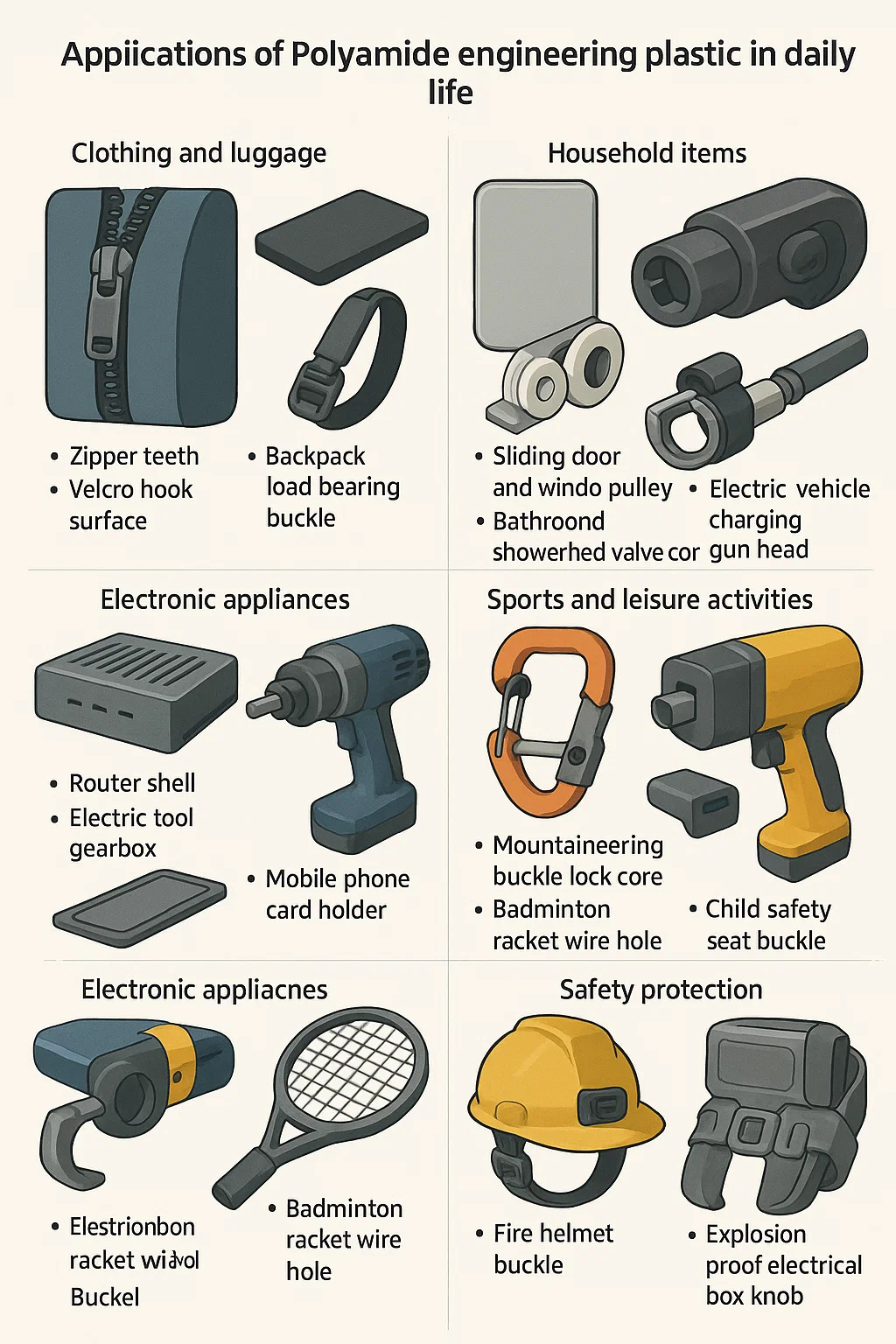 A műanyag poliamid A napi életben több mezőt áthatol, és alapértéke az acél műanyaggal való cseréjének jellemzőiben rejlik, könnyű és tartós. A konkrét tipikus forgatókönyvek a következők: