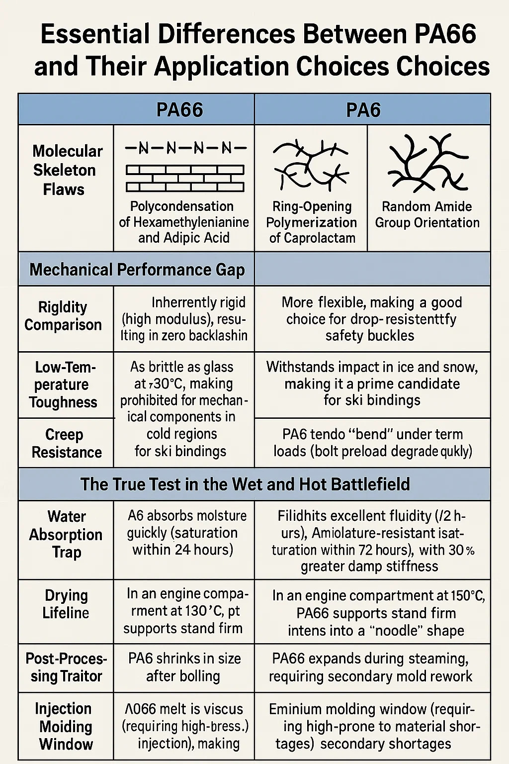 Víz abszorpciós csapdája: A PA6 gyorsan felszívja a nedvességet (24 órán belül telítettség), ami forrás után 3% -os dimenziós növekedést eredményez; A PA66 nedvességálló (telítettség 72 órán belül), 30% -kal nagyobb nedves merevséggel.