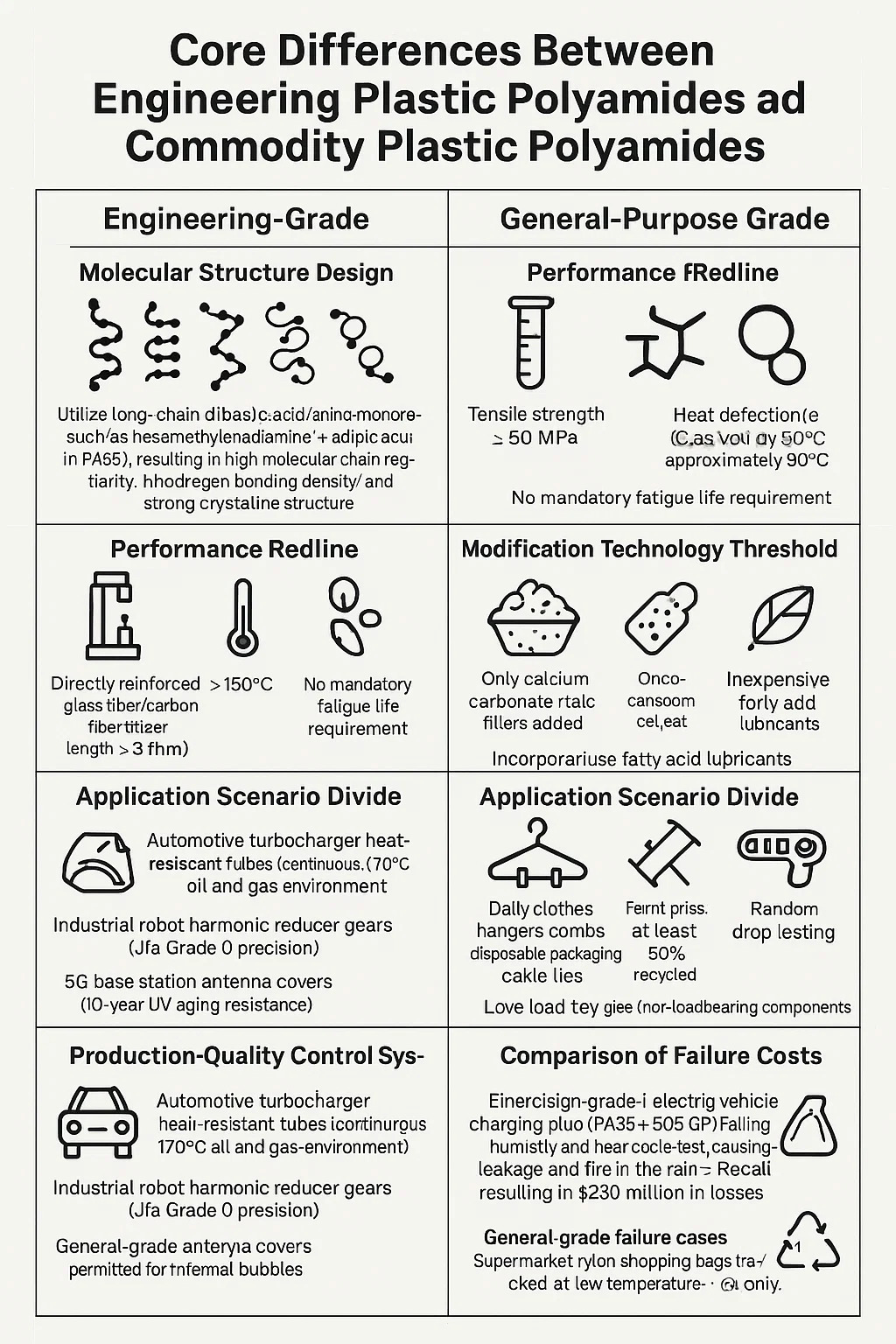 Műszaki minőségű: A hosszú láncú dibázisossav/amin-monomereket (például a hexametilén-diamin adipinsavat a PA66-ban) használja, ami nagy molekuláris lánc szabályosságot, nagy hidrogénkötési sűrűséggel és erős kristályos szerkezetet eredményez.